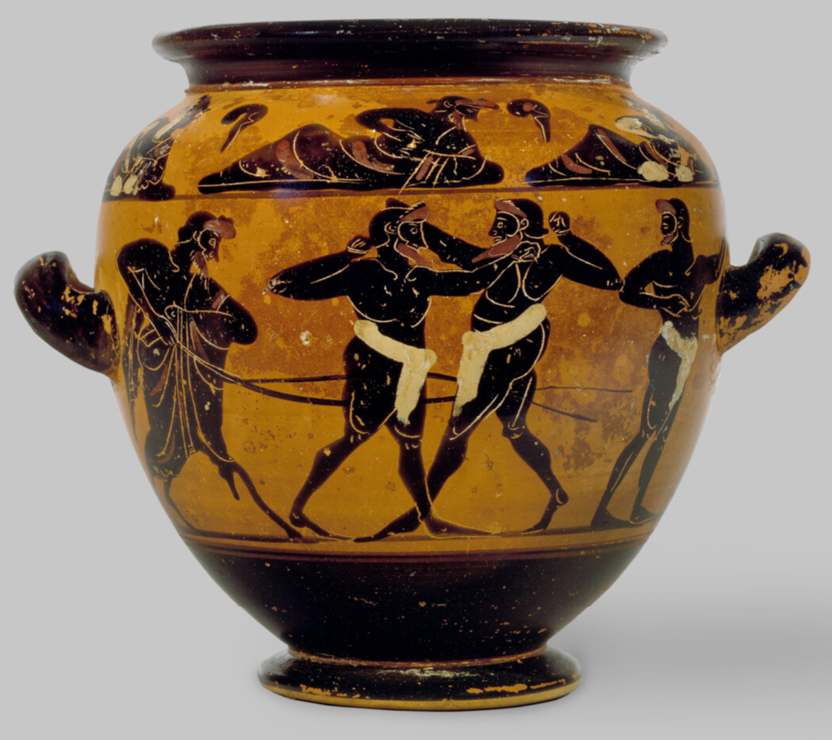 Stamnos (serving/storage jar) with athletes in loinclothes, 550-500 BCE