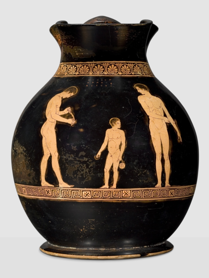 This Attic red-figure chous (wine jug) is dated from 450 to 440 BCE and attributed to the Achilles Painter by John Beazley. It is currently located at Basel, Antikenmuseum und Sammlung Ludwig and was acquired via donation in 1982 by Fritz Bernheim; the object number is BS 485. The chous is 23.1 cm in height. The chous depicts two nude athletes holding strigils, cleaning dirt, sweat, and oil off their bodies after practice. The figure on the left cleans the hollow of the strigil pushing out the accumulated debris; the figure on the right scrapes his left arm with the strigil. The athletes stand on either side of a nude child or slave holding an aryballos and what looks to be a strigil. Considering the body language of the two athletes, they frame the middle figure thereby directing the viewer’s attention to the center despite this being the smallest person. Emphasising the middle figure is notable as it not only draws attention to the smallest person but also the person with the least amount of status as they are either a child or slave. Even if the child/slave is in the center, the musculature and face detailing privilege the athletes who are rendered in accordance with ancient Greek aesthetic ideals. The iconography suggests the middle figure is a slave working in the gymnasium (palaistra), helping the athletes, and explains his less-idealized features (as opposed to the athletes), categorizing him as other (non-Greek). Showing a moment of calm and serenity, the scene is relaxed offering athletes a respite from their training. The scene is bordered by a palmette pattern on top and a meander pattern on the bottom with a simple line on either side of the scene. On the opposite side of the scene, underneath the handle, is a palmette motif. The chous is inscribed between the two athletes with a dedication to Euaion, son of the poet Aeschylus, who is praised for his beauty (“Euaion kalos Aischylo” or “Euaion the son of Aeschylus is lovely”). The inscription legitimizes Euaion’s lineage as an Athenian with civic rights who conforms to Greek aesthetic ideals of kalos (beauty). No such claim or privilege awaits the middle figure who would have been excluded from civic life and political rights.